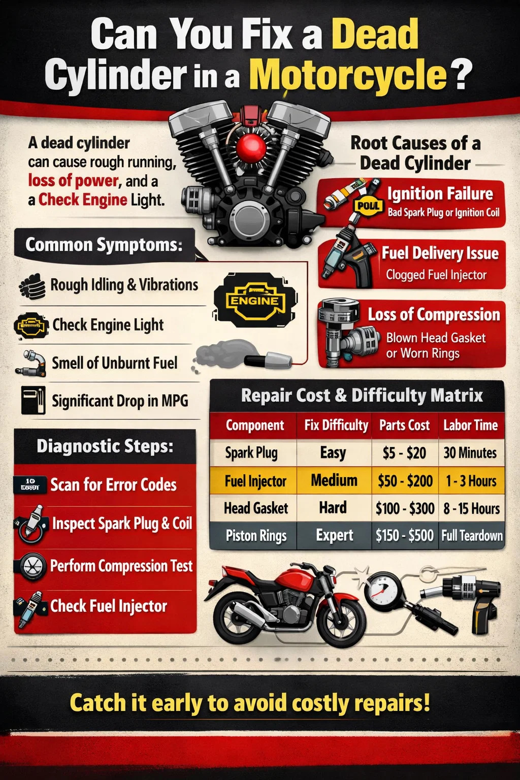 Pokud je zapalovací svíčka ucpaná nebo zapalovací cívka selhala, směs je v tom specifická motocyklový válec nezapálí se. Výměna zapalovací svíčky je nejběžnějším řešením. Pokud je cívka mrtvá, její výměna za cívku z pracovního válce je skvělý způsob, jak otestovat, zda se „smrt“ přesune na nové místo.