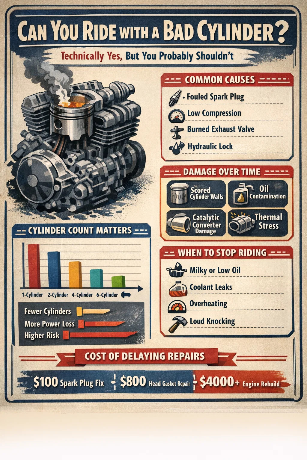 You can physically drive a vehicle with one bad cylinder — the engine will still run — but doing so puts the rest of the engine under serious strain and risks turning a manageable repair into a catastrophic rebuild. A misfiring or dead motorcycle cylinder doesn't just rob you of power; it creates cascading mechanical stress that can damage pistons, warp cylinder heads, foul spark plugs in neighboring cylinders, and even crack the engine block if left unaddressed long enough. Whether you're riding a two-cylinder parallel twin or a four-cylinder inline sportbike, the answer to "how long can I keep going like this?" is almost always: not as long as you think.