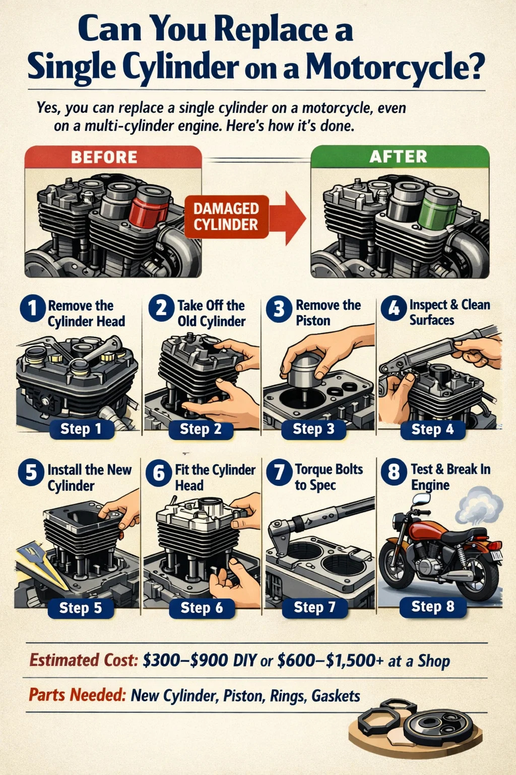 Krátká odpověď je ano – můžete vyměnit jeden válec motocyklu, a zejména u jednoválcových motocyklů je to jedna z jednodušších prací na motoru, kterou může zkušený domácí mechanik nebo obchod zastat. Ať už řešíte rýhovaný vývrt, prasklou hlaveň nebo silné opotřebení, které honování již nedokáže opravit, výměna válce je dobře zavedenou cestou opravy. U víceválcových motocyklů platí stejný princip: jednotlivé válce lze vyměnit bez tahání nebo přestavby celého motoru, i když složitost se zvyšuje s počtem zúčastněných válců.