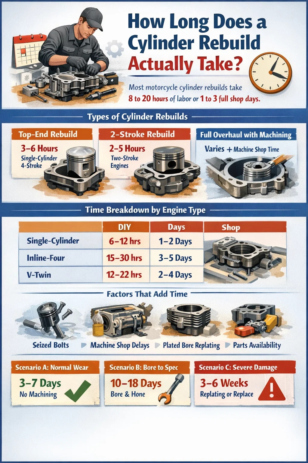Pro většinu motocyklový válec přestavby, měli byste plánovat 8 až 20 hodin práce pokud práci děláte sami, nebo zhruba 1 až 3 celé nákupní dny pokud je práce předána profesionálnímu mechanikovi. Tento rozsah je účelově široký – skutečný čas do značné míry závisí na typu motoru, stavu válce, zda je potřeba práce ve strojírně a dostupnosti dílů.