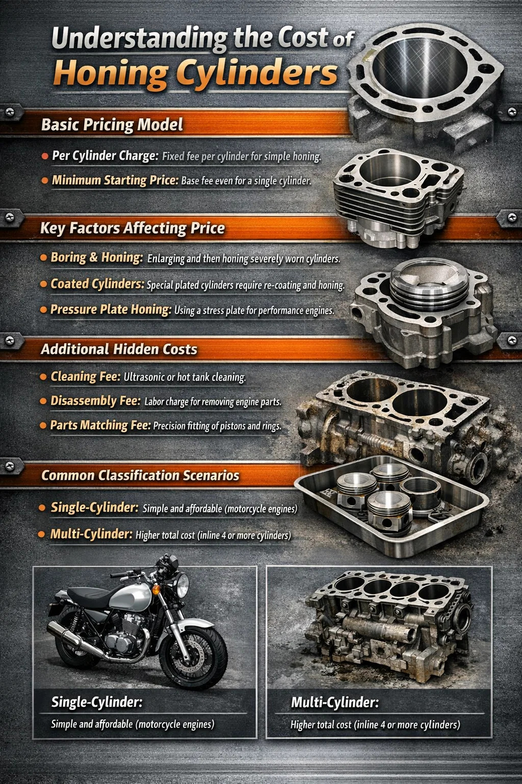 Jednoduché honování vs. vrtání a honování: Pokud je válec silně opotřebovaný, jednoduché honování problém nevyřeší. Nejprve to bude vyžadovat „vyvrtání“ (zvětšení otvoru) a poté jemné honování. Tato kombinovaná služba obvykle stojí více než dvojnásobek ceny jednoduchého honování.