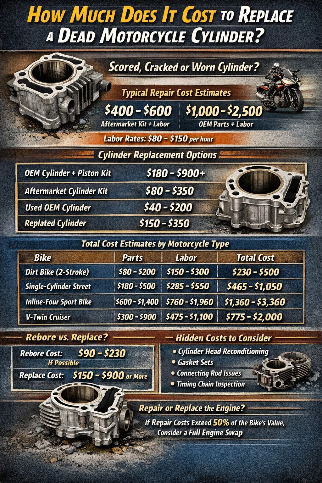 Pokud je válec vašeho motocyklu zadřený, prasklý nebo opotřebovaný nad rámec specifikací, díváte se na účet za opravu, který se obvykle pohybuje od 300 až 1 500 USD nebo více , v závislosti na typu motoru, ceně náhradního válce nebo sady válců a sazbě práce ve vašem obchodě. Na malém jednoválcovém dojezdovém kole může cenově výhodná sada válců pro aftermarket stát pouhých 80 až 150 USD za samotné díly. Na dvou nebo čtyřválcovém sportovním motocyklu s velkým zdvihovým objemem se mohou součásti válců OEM dostat přes 600 až 900 USD, než mechanik vůbec vezme do ruky klíč. Přidejte práci – která obvykle stojí 80 až 150 $ za hodinu – a práci, která trvá čtyři až osm hodin, a celkové náklady rychle rostou.