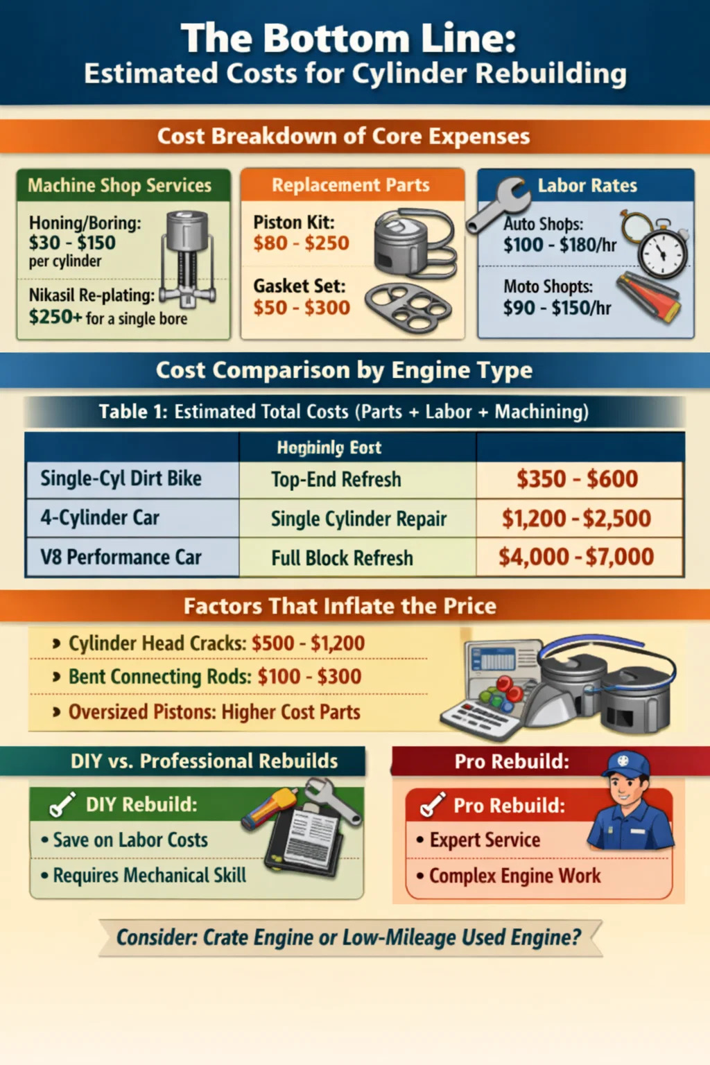 Než se zavážete, vždy porovnejte náklady na přestavbu s „motorem v přepravce“ nebo s použitým motorem s nízkým počtem najetých kilometrů. V mnoha případech, pokud je poškozeno více válců, je kompletní výměna motoru levnější než vysoce kvalitní přestavba.