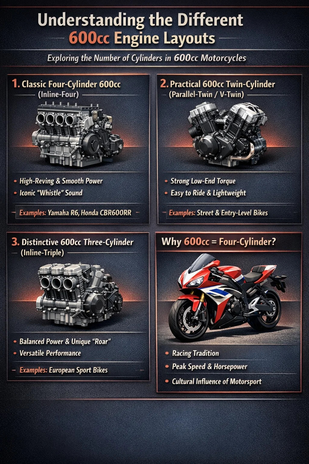 „600cc“ představuje zdvihový objem motoru (celkový objem všech válců), podobně jako celková plocha domu. Počet válců se vztahuje k uspořádání místnosti. V rámci třídy zdvihového objemu 600 ccm je „design místnosti“ neuvěřitelně rozmanitý.