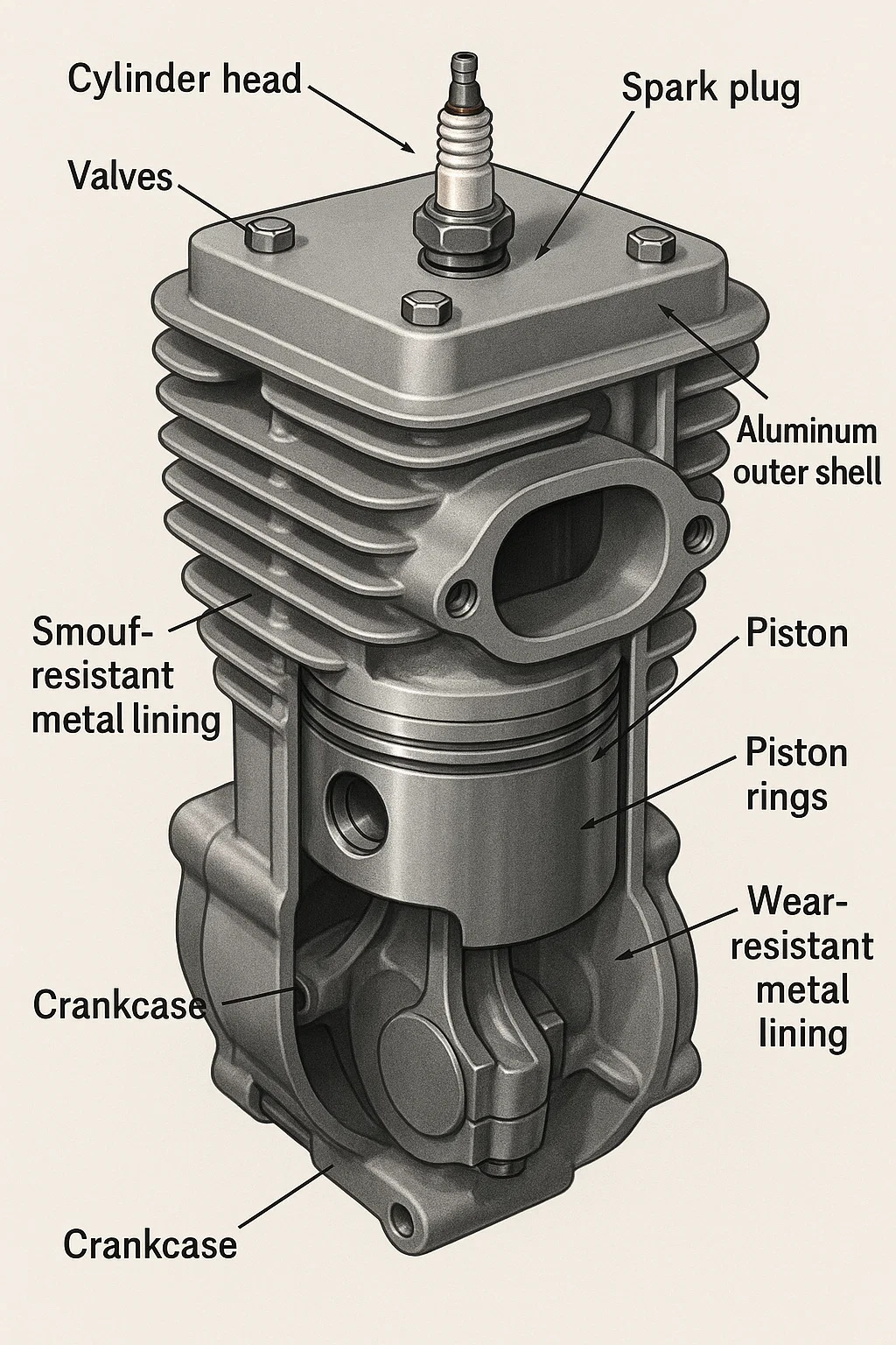 Běžně má hliníkový vnější plášť (lehký rychlý odvod tepla) s kovovým obložením odolným proti opotřebení (jako je nikl-silikonový povlak nebo železná vložka), aby se zabránilo opotřebení pístu.