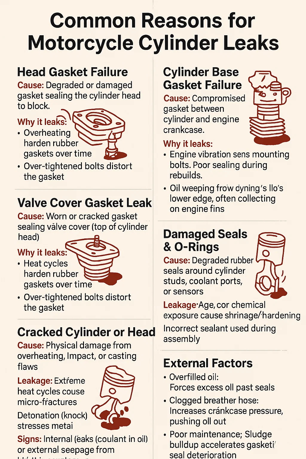 Známky: Olej stékající ze spodního okraje válce, často se hromadící na žebrech motoru.